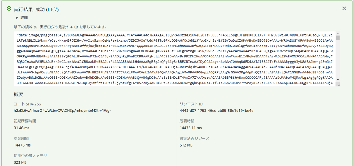 今回は簡略化のために実用的なS3保存ではなくbase64での出力に留めましたが、returnから下の部分を書き換えることでS3保存やSlackへの通知など実用的な使い方にも応用できます。