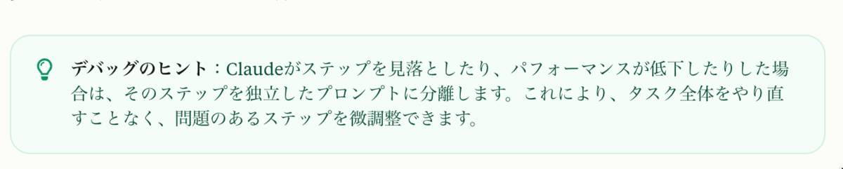 単一のプロンプトの場合はClaudeが時々ボールを落とすことがあるとのことで、プロンプトを分解することで、問題のあるステップを微調整できるメリットもあるとのことでした。