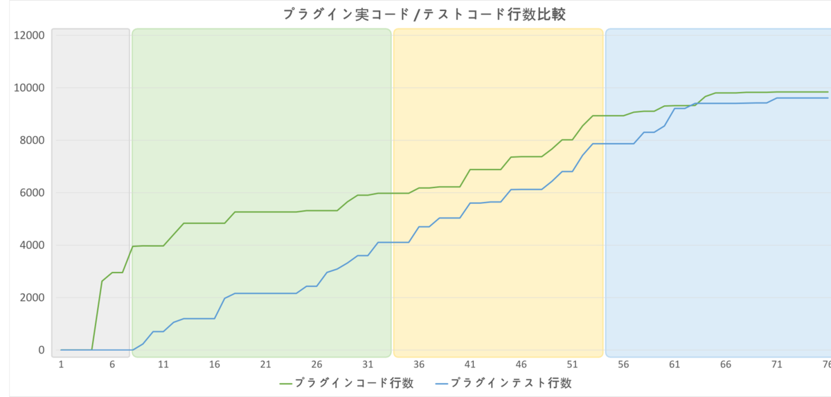 一見すると非常にそれらしい進行になっています。 実際、プラグイン本体の実装量の推移を見てみると、次のような安定した増加量を示していました。