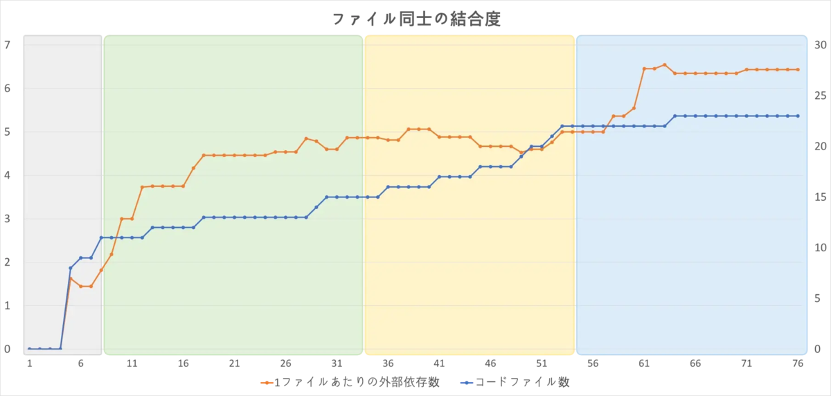 序盤は他のファイルとの連携処理も正しく組んでいますが、中盤以降、なぜか実装量もファイル数も増え続けているのに、 インポート処理など実装間での連携が全く増えなくなっています。