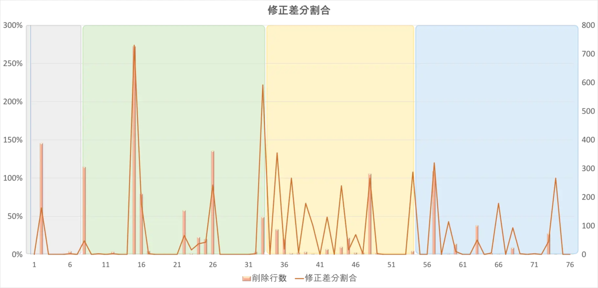 といった行動が増えた結果、追加差分のみのコミットと削除修正を含むコミットが綺麗に交互に繰り返すようになりました。うーん。