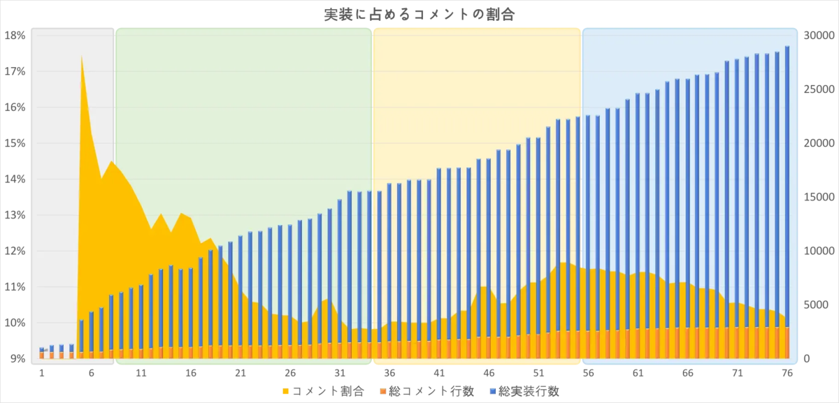 これは成果物全体に占める「コメントに相当する行」の割合です。 開発初期はコメントの追記よりも遥かに積極的にコードを書いていたものの、 機能強化フェーズあたりではコメントの割合が再度増えはじめました。